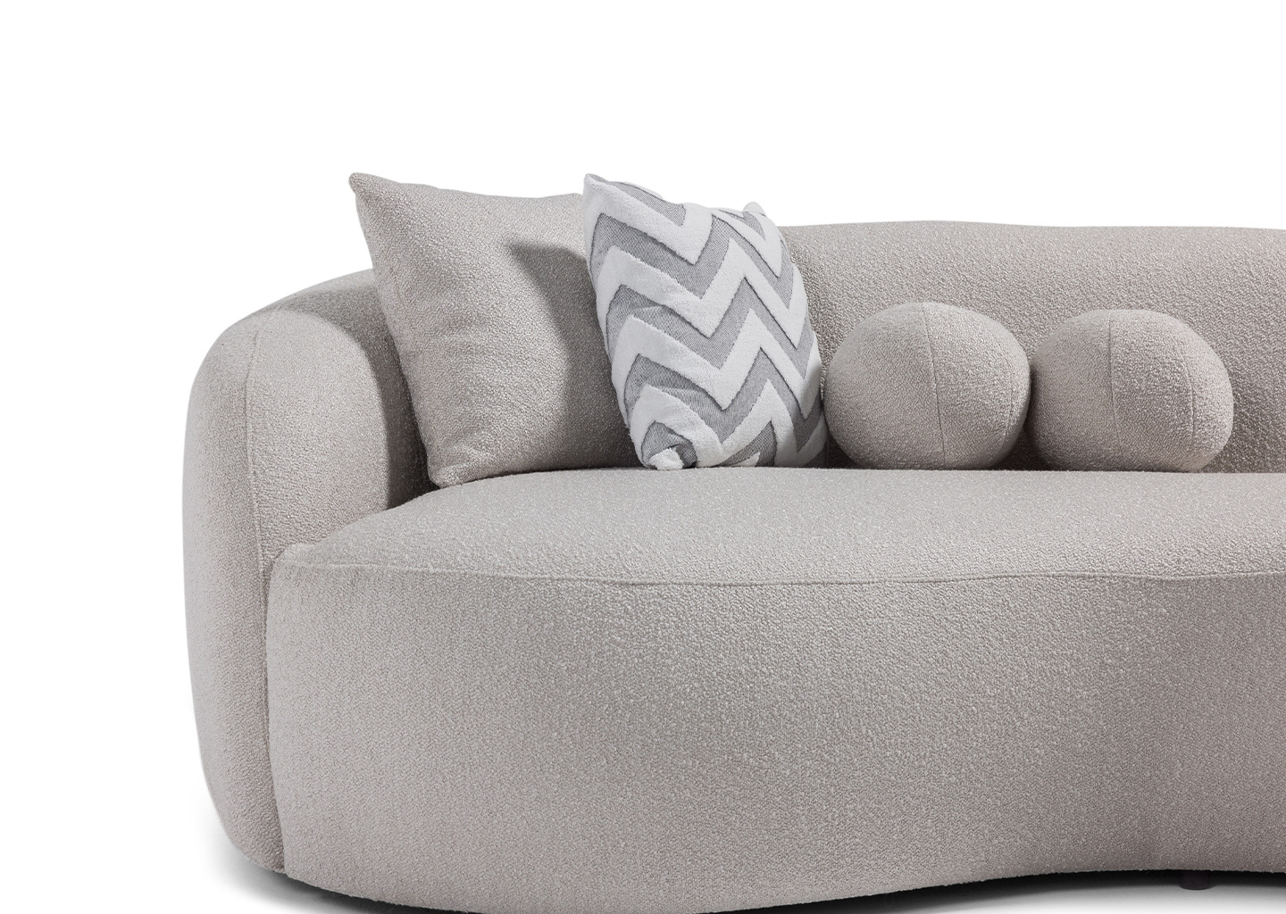 Our Bella Sofa is generously upholstered in lavish bouclé fabric, renowned for its rich texture and inviting feel. The plush, cushioned seating is further enhanced by the inclusion of a set of elegantly designed round and square-shaped pillows, offering an additional layer of comfort and style. The distinctive texture of the bouclé fabric not only provides a luxurious feel but also adds depth and character to the sofa, making it an irresistible centerpiece for your living room.