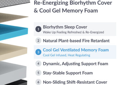 Memory foam is ideal for support and comfort, conforming to your body’s contours to enhance spinal alignment and promote an ideal sleep posture. Our high-density memory foam, infused with Cool Gel, efficiently dissipates body heat and maintains a comfortable sleep temperature.