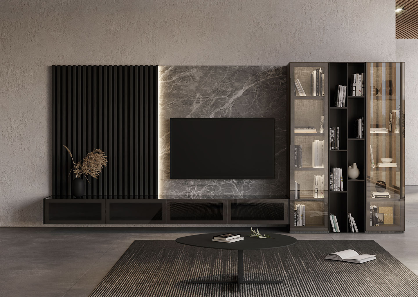 Bringing in a new aesthetic for the living areas, the custom bookcase showcases elegance with wood and ceramic details. The slender grid structure of the unit combines shelves and doors creating various display and storage areas.