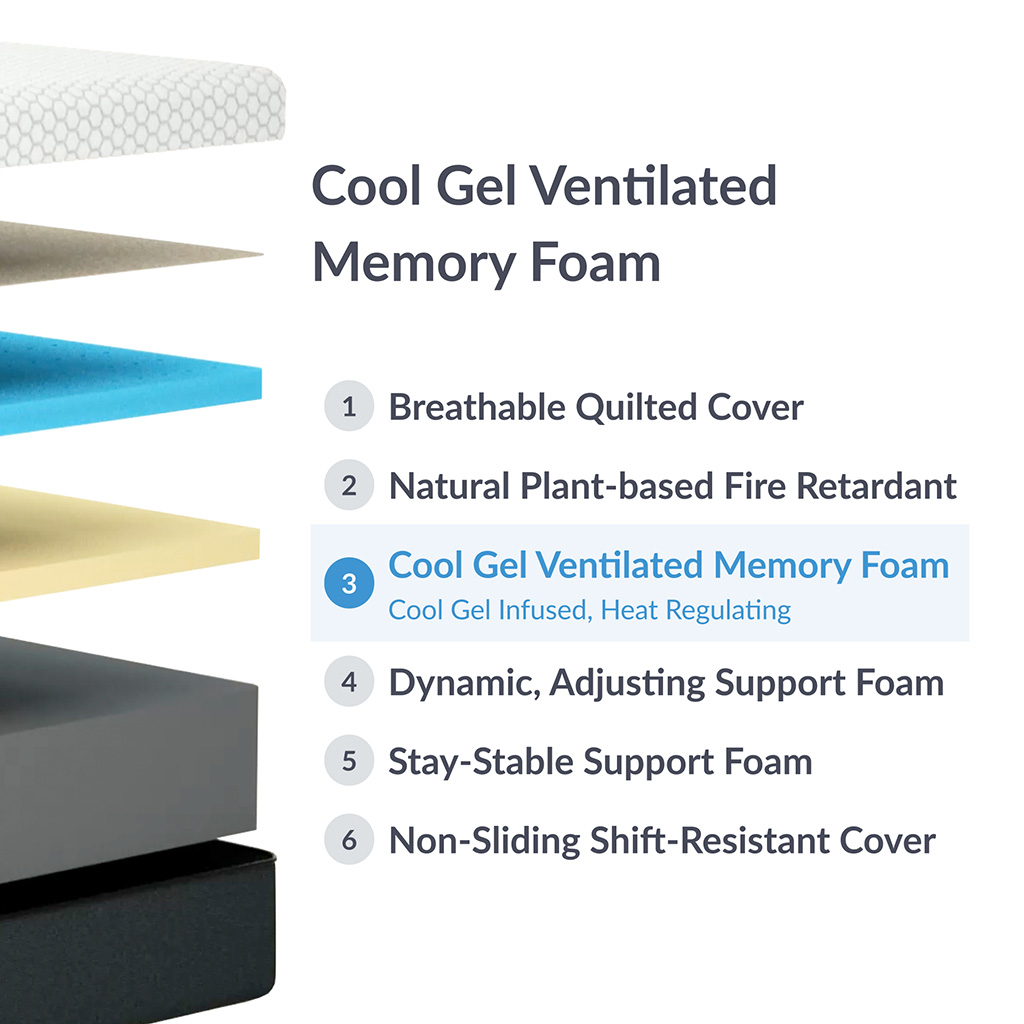 Memory foam is ideal for support and comfort, conforming to your body’s contours to enhance spinal alignment and promote an ideal sleep posture. Our high-density memory foam, infused with Cool Gel, efficiently dissipates body heat and maintains a comfortable sleep temperature.