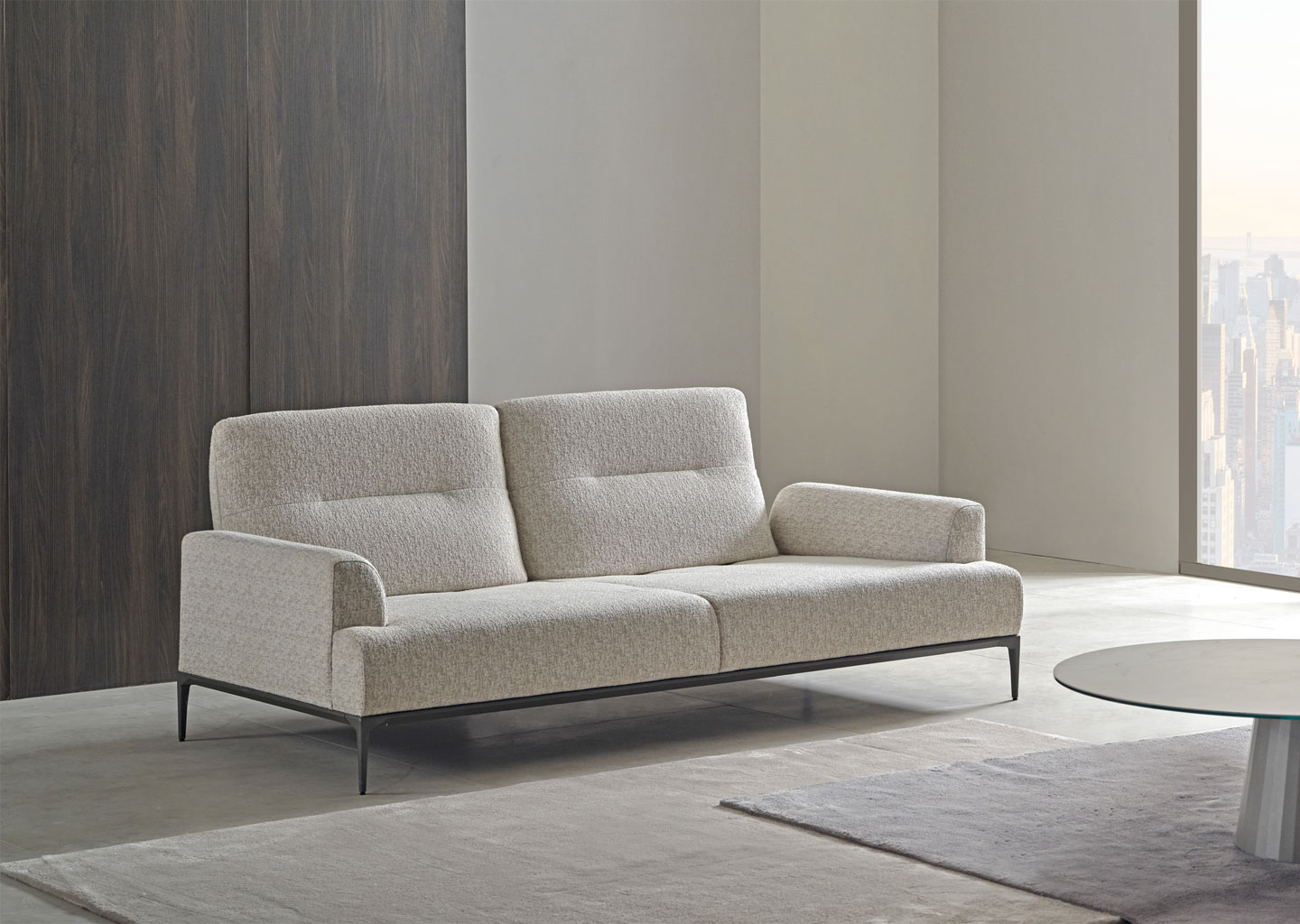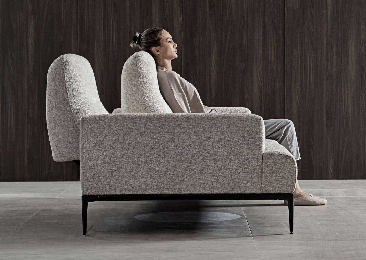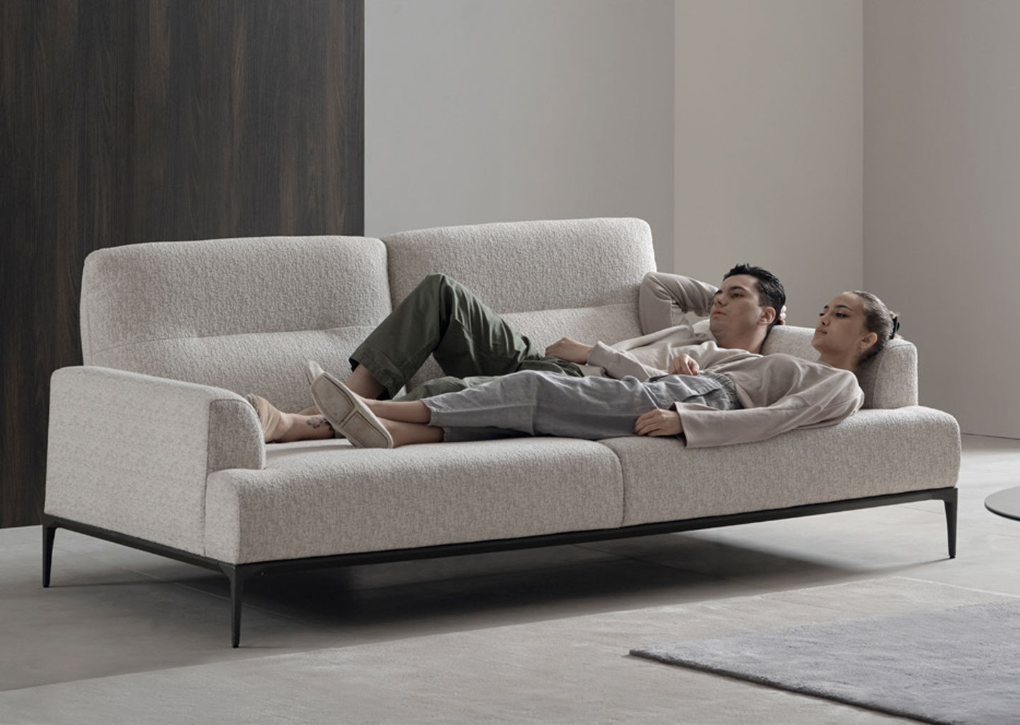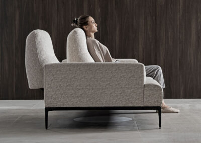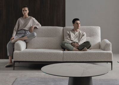 A simple seating that reflects the principles of Modernism. The adjustable backrest of Lovi sofa offers different seating depths for each half of the sofa while elegant curves and slim legs create a soft and airy look.