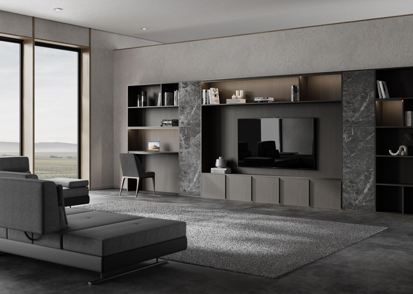 Combining media unit with storage, work area and display shelves, the custom day system makes the most of grand living. LED light system and natural materials add to the chic look of the unit.