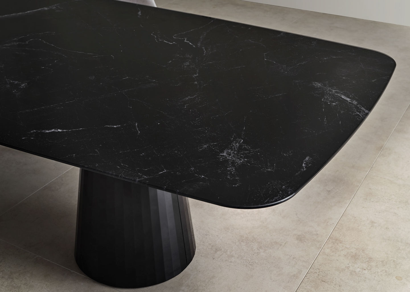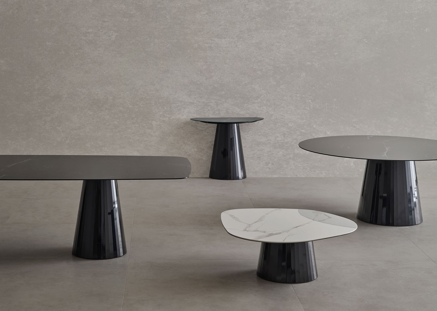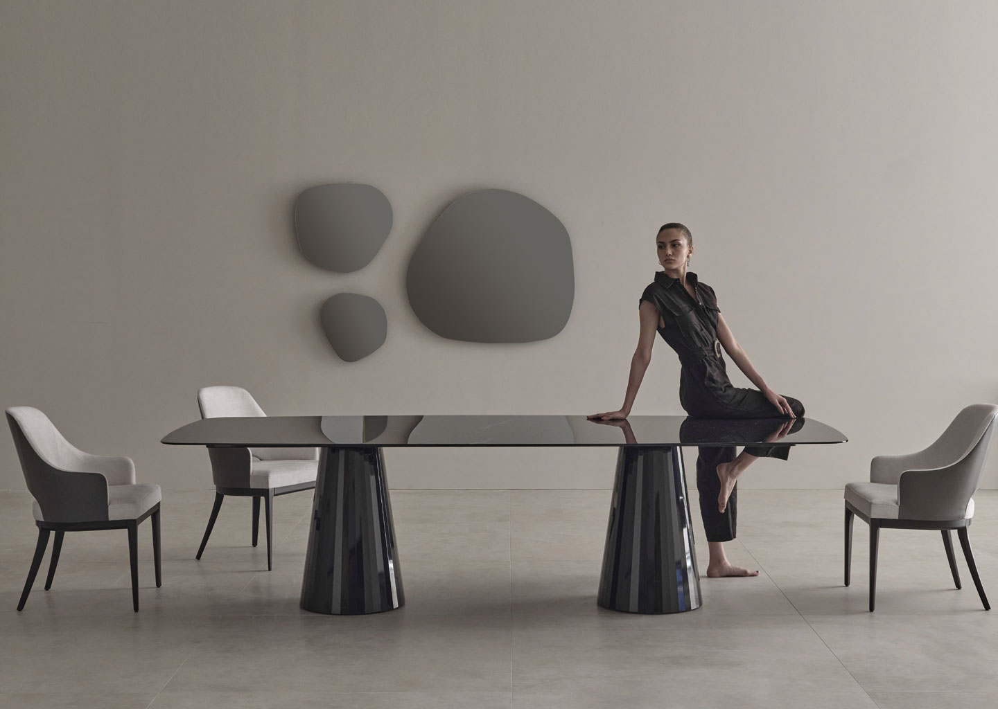 Designed with the feeling of serenity and dynamism in mind, Mons collection combines amorphous forms with natural stone and a glass top that is elevated by the faceted metal base. Elegant with a calm atmosphere, the collection spans dining tables, consoles, and coffee tables.